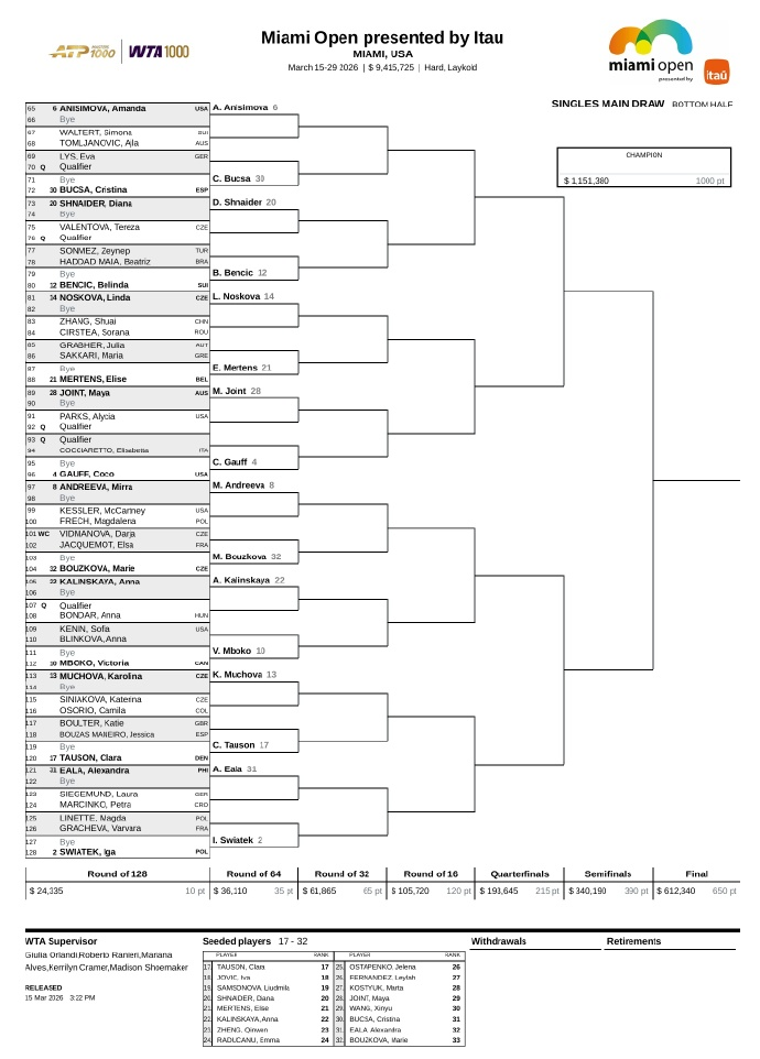 值得一提的是,31号种子伊埃拉与斯瓦泰克同在4/4区,两人或在第三轮相遇。去年迈阿密站,伊埃拉曾在1/4决赛2-0淘汰了斯瓦泰克。